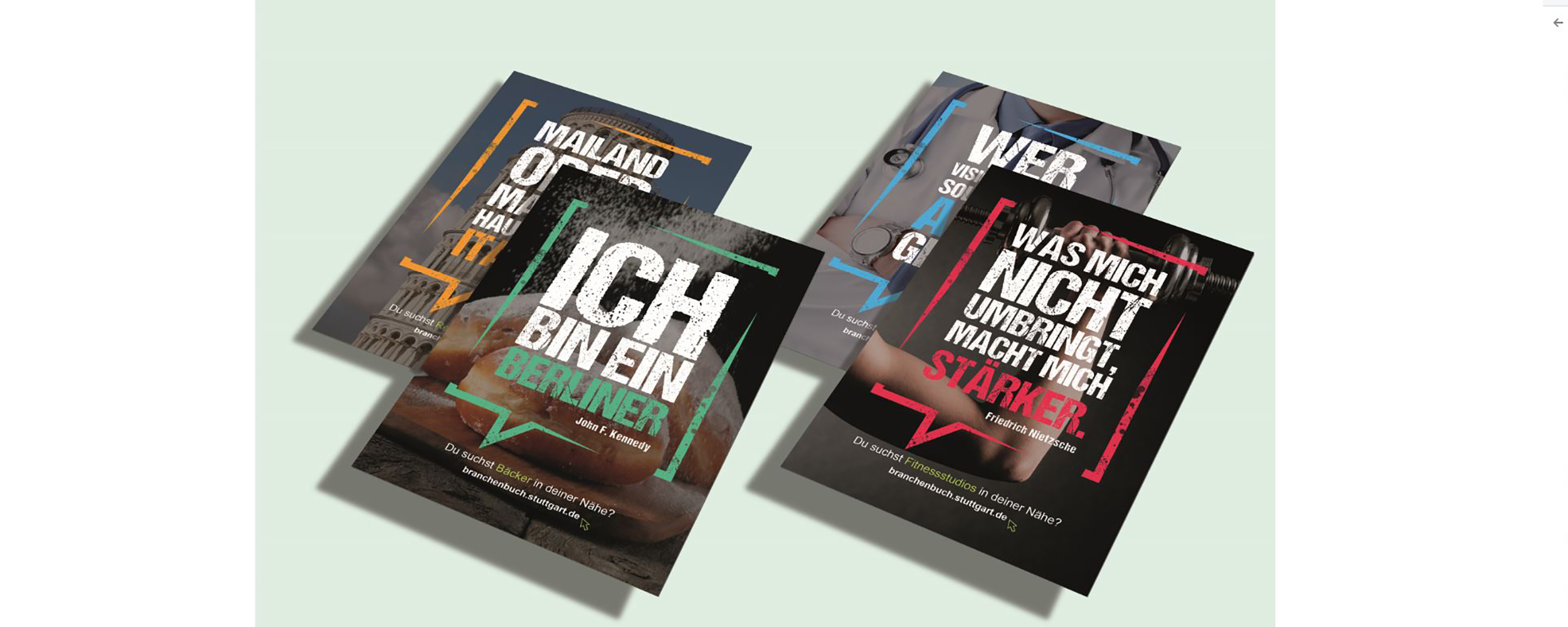 Aufmerksamkeitsstarke Postkarten mit kreativen und witzigen Sprüchen, mit denen für das Branchenbuch Stuttgart geworben wird
